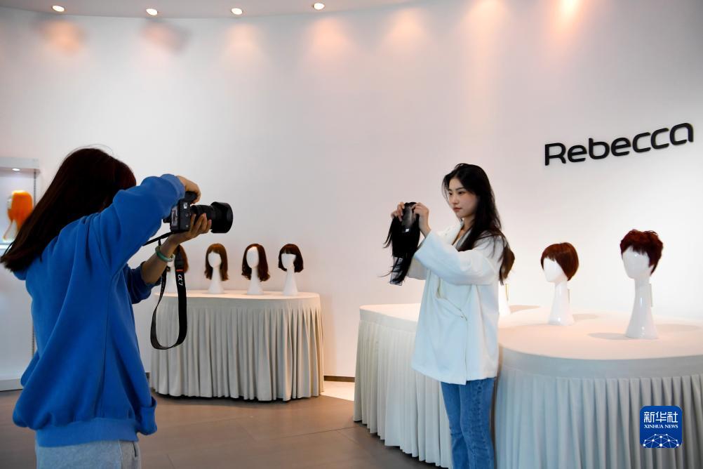 10月11日,工作人員在河南瑞貝卡發(fā)制品股份有限公司的展廳內拍攝產(chǎn)品。