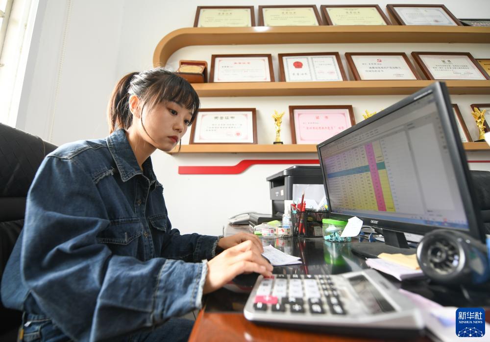 10月10日,在成都崇州市隆興鎮,王伶俐在辦公室記錄今年的售糧數量。