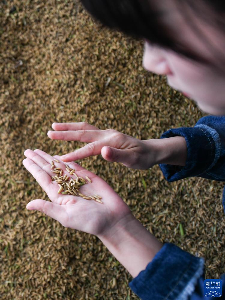 10月10日,在成都崇州市隆興鎮,王伶俐在查看今年新收獲水稻的品質(zhì)。