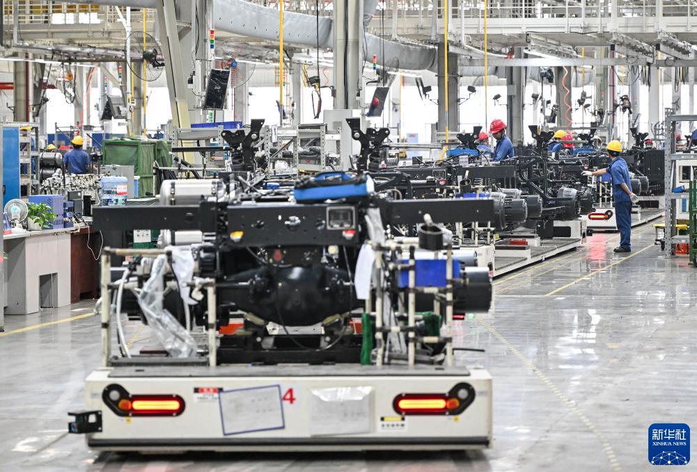 9月26日在位于重慶市兩江新區的上汽紅巖汽車(chē)有限公司總裝車(chē)間拍攝的生產(chǎn)作業(yè)現場(chǎng)。