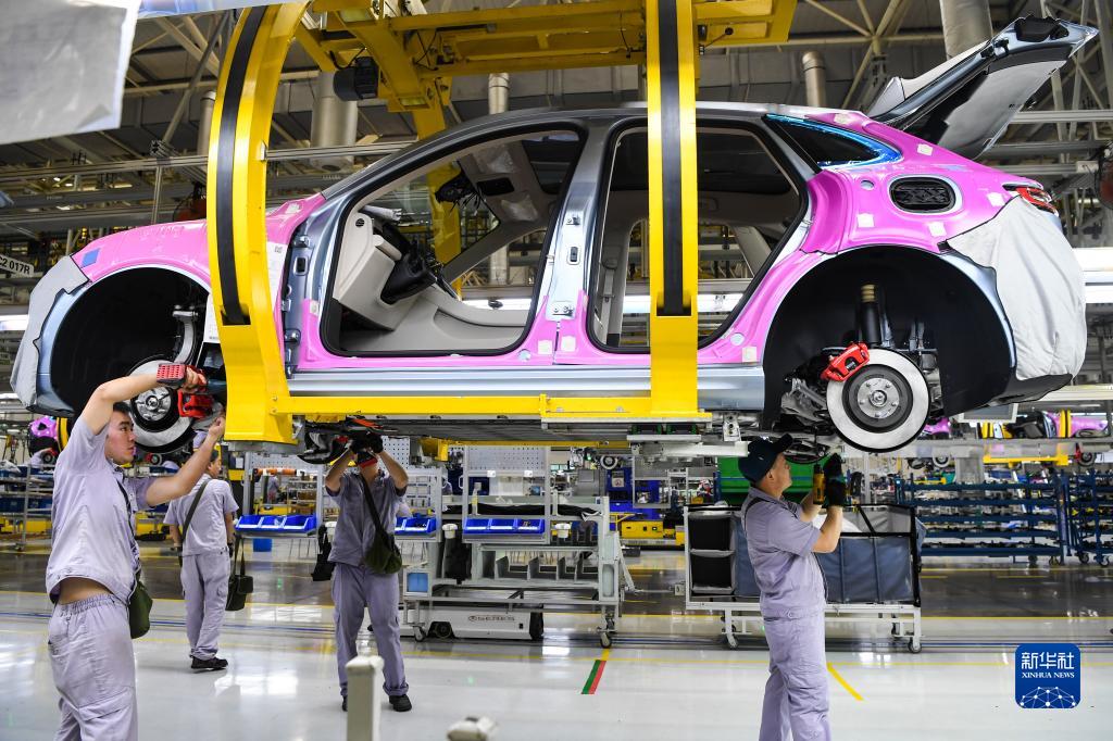賽力斯汽車(chē)有限公司重慶兩江智慧工廠(chǎng)工作人員在生產(chǎn)車(chē)間作業(yè)(2022年6月27日攝)。