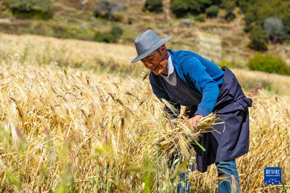 10月12日,在四川甘孜藏族自治州稻城縣亞丁村,村民電珠在收割青稞。