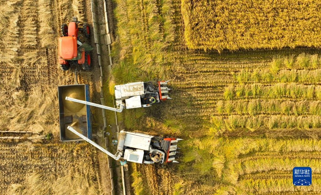 10月12日,在燈塔市東古城子村,水稻收割機將收割的水稻裝車(chē)(無(wú)人機照片)。