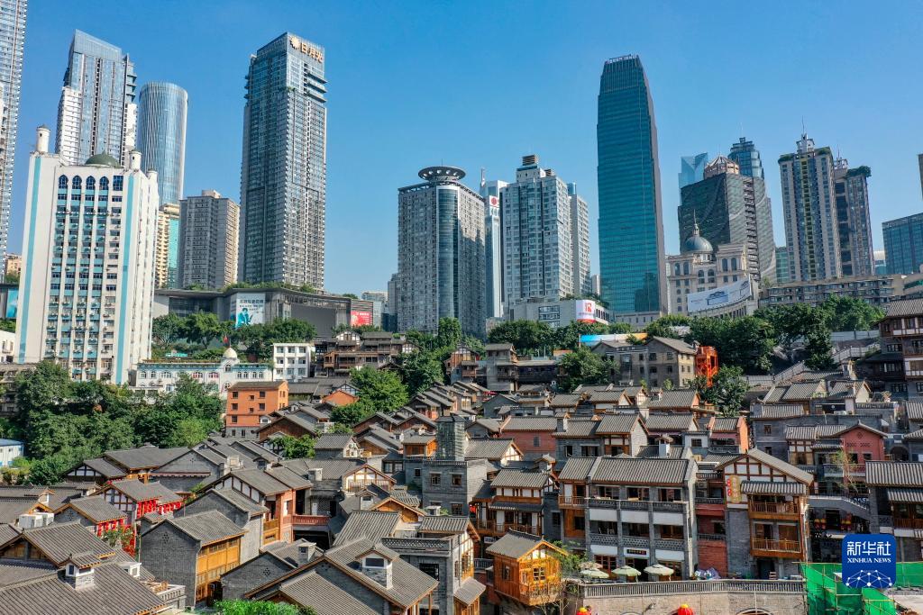 這是2021年9月30日拍攝的重慶解放碑商業(yè)區(上)與十八梯傳統風(fēng)貌區(無(wú)人機照片)。