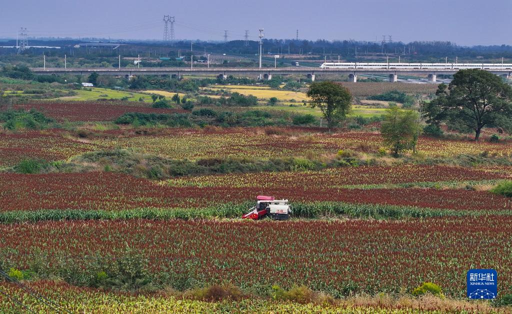 10月12日,安徽省合肥市肥西縣銘傳鄉建設村村民駕駛農機收割高粱(無(wú)人機照片)。