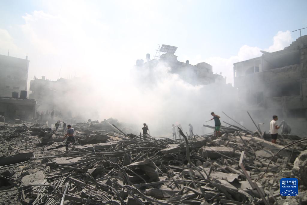 10月12日,在加沙地帶南部城市拉法,人們查看遭以色列空襲的受損建筑。
