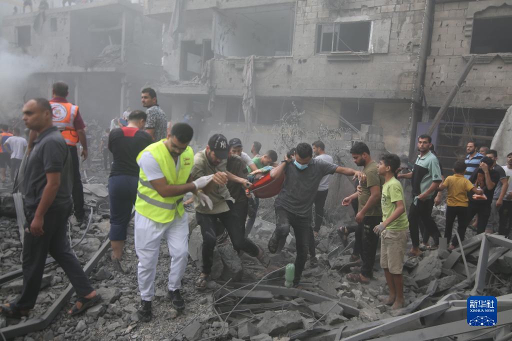 10月12日,在加沙地帶南部城市拉法,人們在遭以色列空襲的受損建筑中救援傷者。