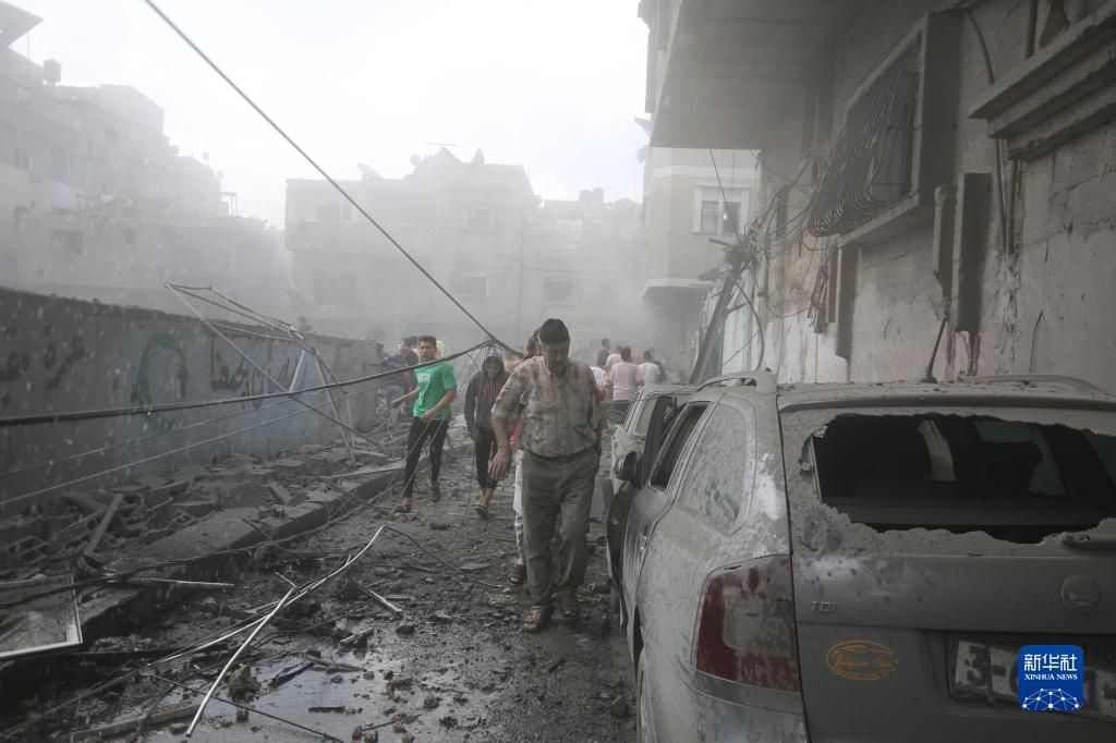 10月12日,在加沙地帶南部城市拉法,人們在遭以色列空襲的受損建筑中救援傷者。