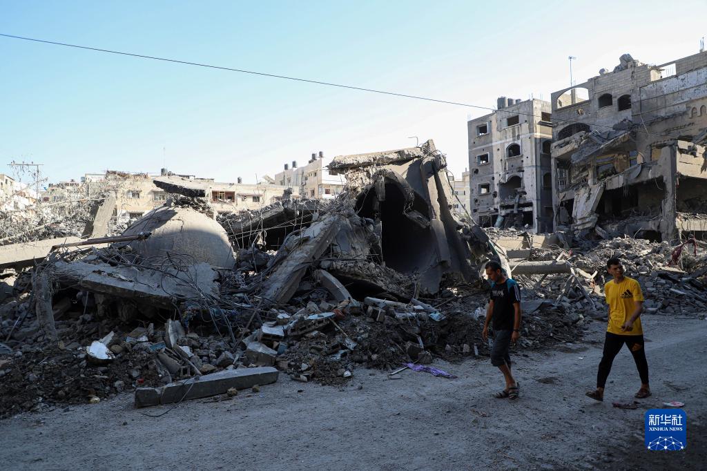 10月12日,在加沙城,人們走過(guò)被以色列軍隊空襲炸毀的建筑。