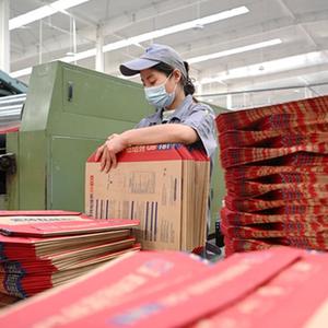 10月12日,河北元氏縣一家新材料生產(chǎn)企業(yè)工人在車(chē)間生產(chǎn)線(xiàn)上工作。