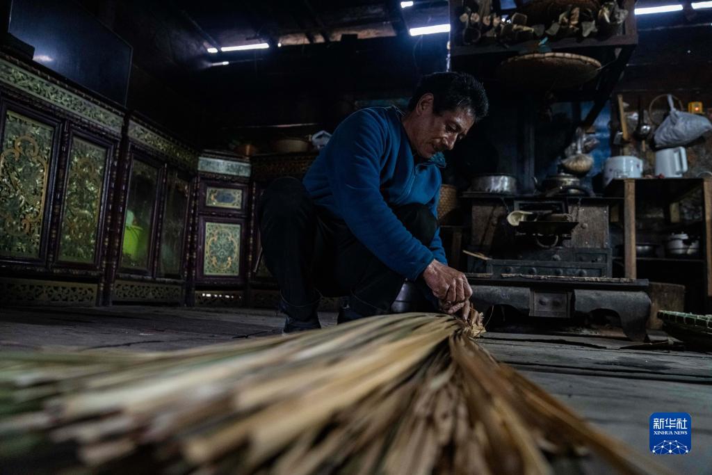在西藏墨脫縣背崩鄉巴登村,一名村民在整理藤竹條(10月11日攝)。