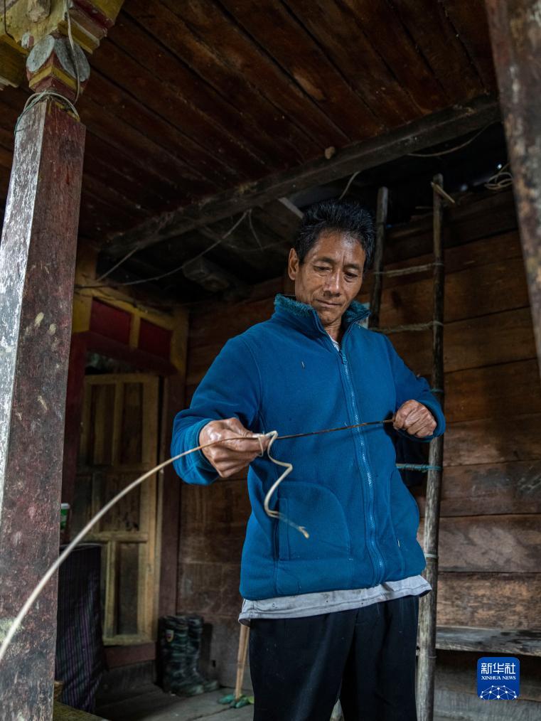 在西藏墨脫縣背崩鄉巴登村,一名村民將藤竹條切削成適合的寬度(10月11日攝)。