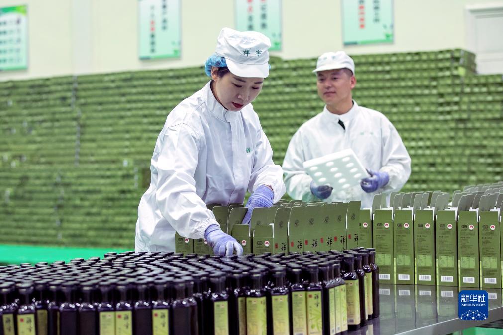 10月11日,在隴南市武都區一家油橄欖加工企業(yè)生產(chǎn)線(xiàn)上,工作人員在將橄欖油裝箱。