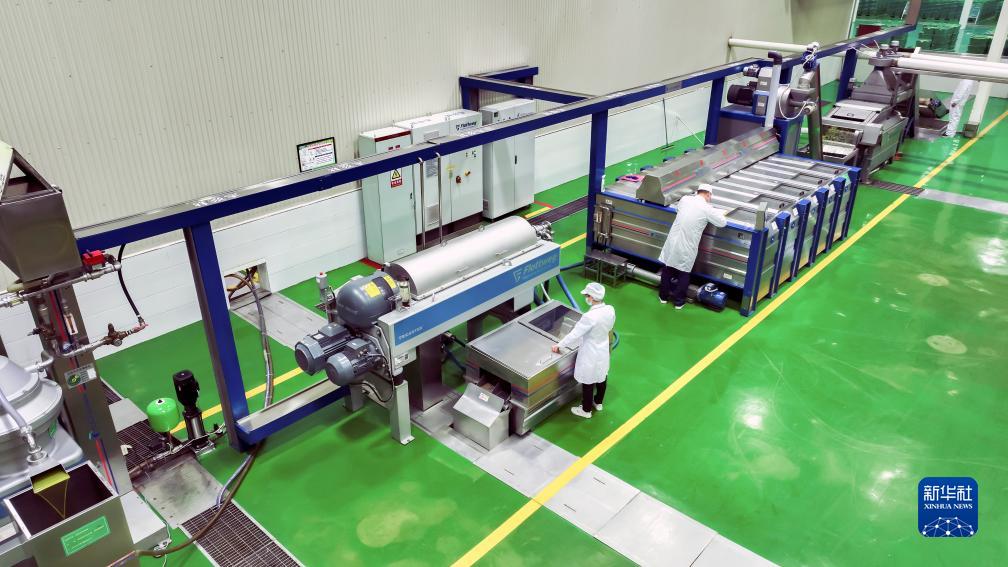 10月11日,隴南市武都區一家油橄欖加工企業(yè)的工人在生產(chǎn)線(xiàn)上進(jìn)行榨油作業(yè)(無(wú)人機照片)。