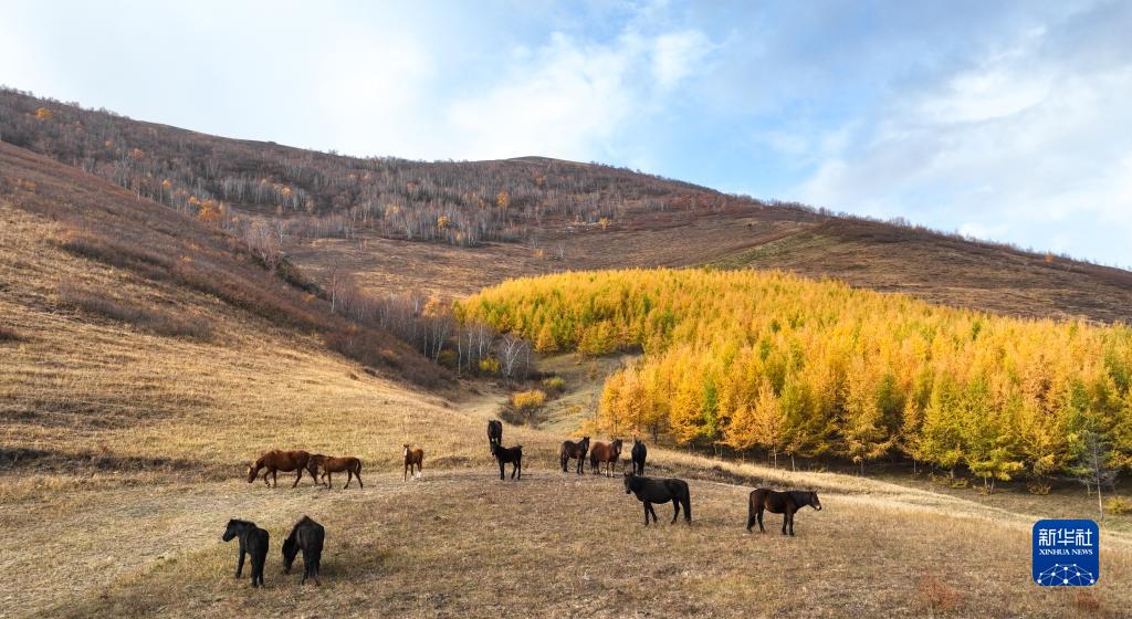 10月13日在內蒙古自治區赤峰市克什克騰旗拍攝的馬群(無(wú)人機照片)。