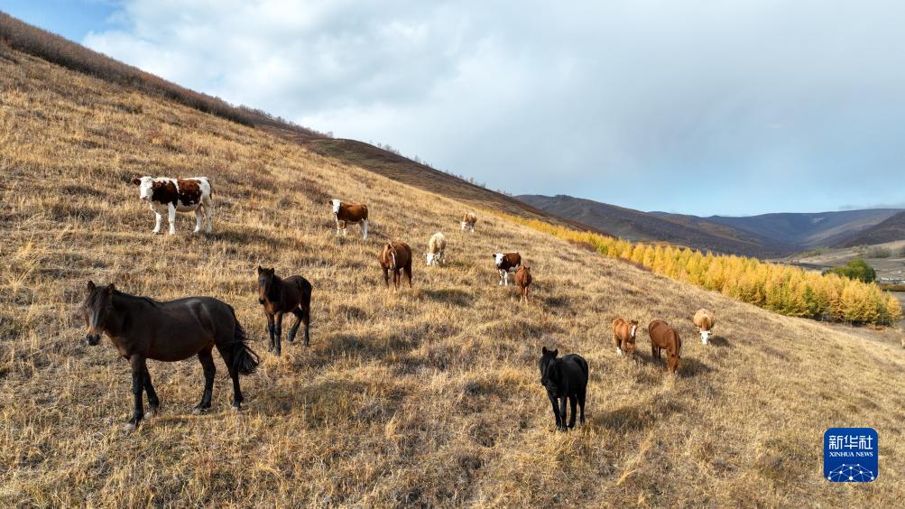 10月13日在內蒙古自治區赤峰市克什克騰旗拍攝的牧群(無(wú)人機照片)。