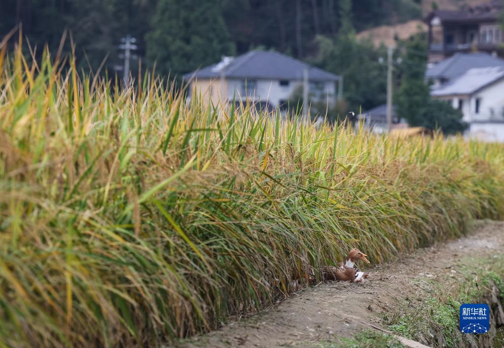 這是10月13日在杭州臨安太陽(yáng)鎮杭州臨安元生糧油專(zhuān)業(yè)合作社生態(tài)稻田內拍攝的散養著(zhù)的鴨子。