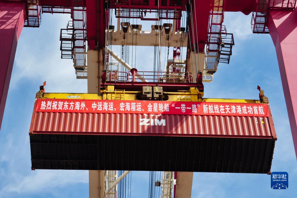 2020年10月27日,貨輪在天津港裝載集裝箱。