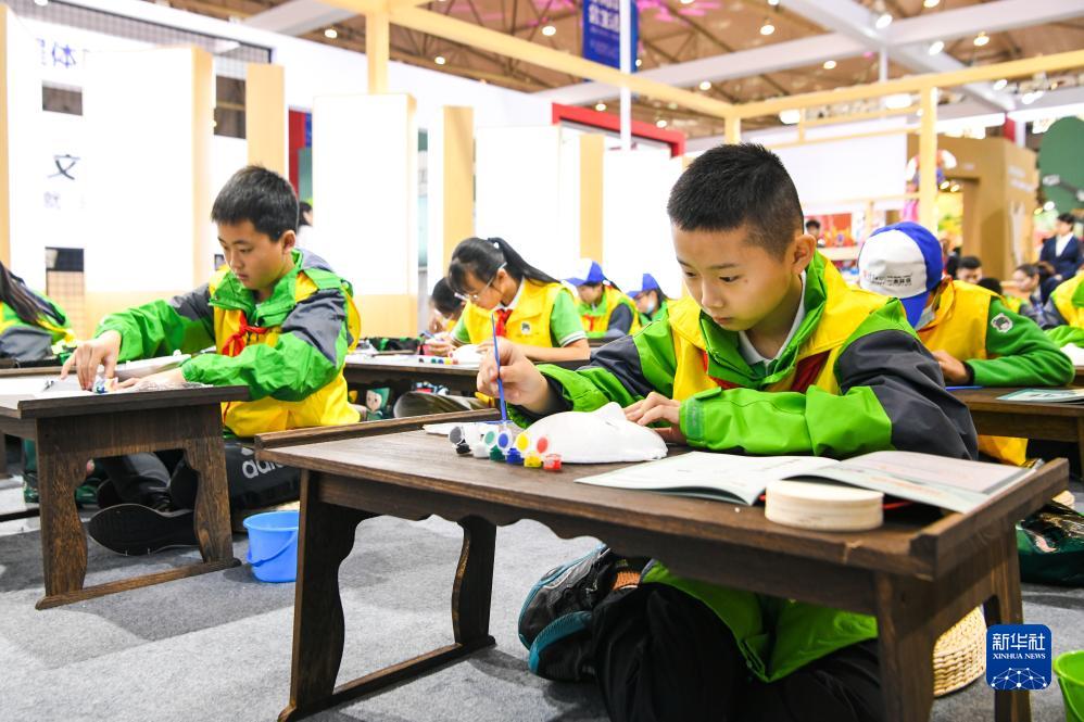 10月13日,在位于成都市世紀城新國際會(huì )展中心的2023天府書(shū)展主展場(chǎng),參加研學(xué)活動(dòng)的學(xué)生在體驗臉譜繪制。