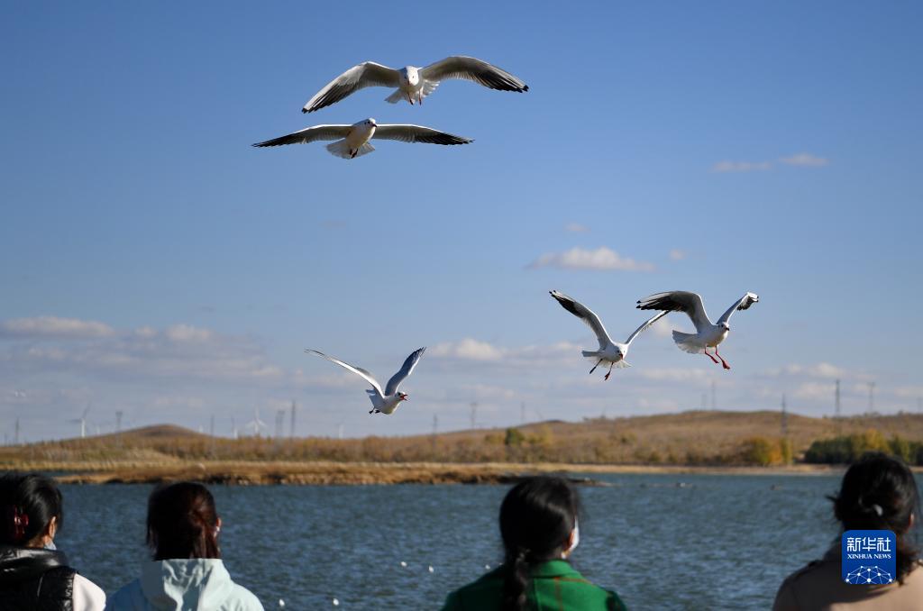 10月13日,游客在康巴諾爾國家濕地公園內觀(guān)賞紅嘴鷗。