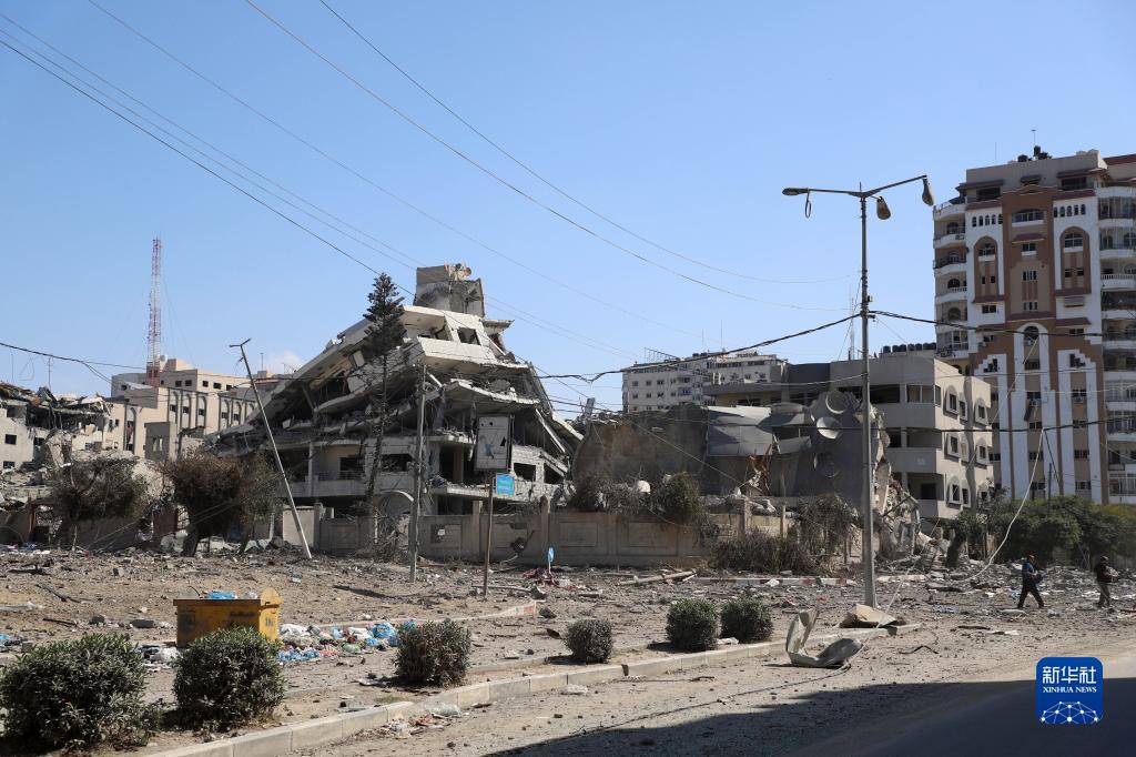 這是10月13日在加沙城拍攝的遭以色列空襲損毀的建筑。