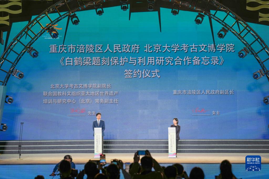 這是10月13日在重慶涪陵舉辦的2023白鶴梁旅游文化節開(kāi)幕式上拍攝的《白鶴梁題刻保護與利用研究合作備忘錄》簽約儀式現場(chǎng)。