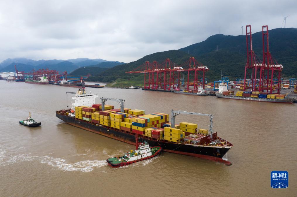 在浙江省寧波舟山港穿山港區集裝箱碼頭海域,“地中海琳妮三號”(MSC RINI Ⅲ)輪在拖輪的助力下緩緩靠泊(無(wú)人機照片,9月21日攝)。