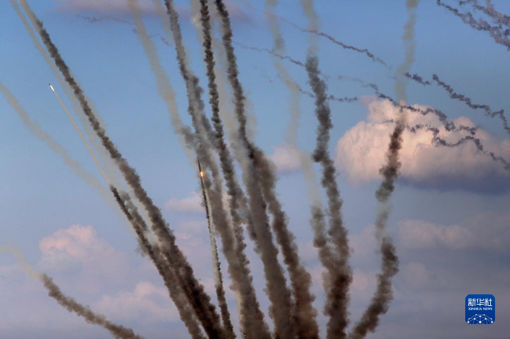 這是10月10日在加沙城拍攝的向以色列發(fā)射的火箭彈。
