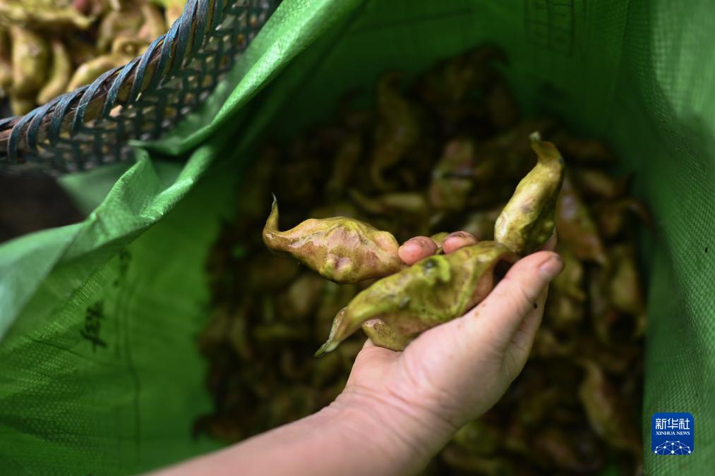 10月14日,南潯區和孚鎮新荻村村民展示采摘的菱角。