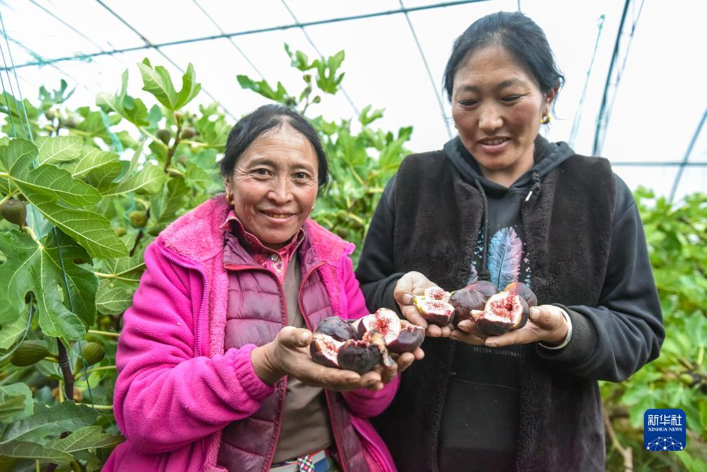 10月13日,在理塘縣瑪吉阿米花園農莊的高原蔬菜大棚里,當地藏族群眾志瑪澤仁(左)和所珍展示采摘的無(wú)花果。