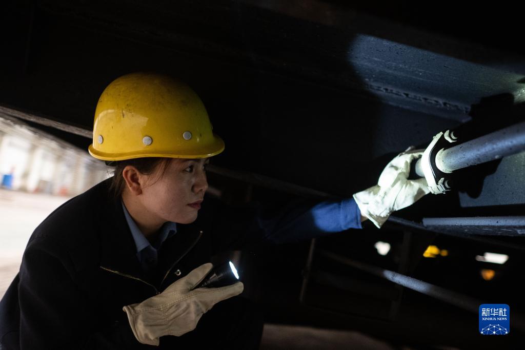 10月12日,在中國鐵路青藏集團有限公司西寧東車(chē)輛段制動(dòng)班組,馬婷在檢查貨車(chē)車(chē)輛制動(dòng)主管。
