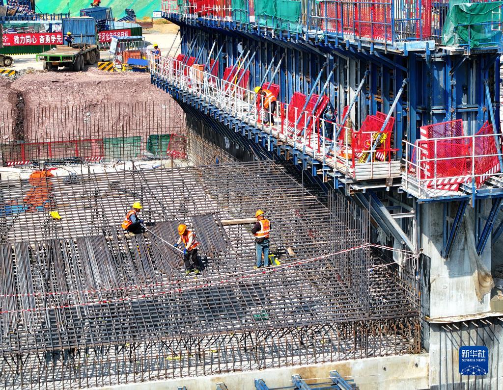 工人在平陸運河青年樞紐施工現場(chǎng)架設鋼筋(10月3日攝,無(wú)人機照片)。