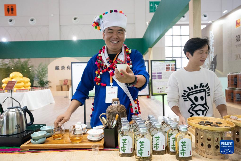10月14日,參展商在第十五屆中國云南普洱茶國際博覽交易會(huì )上邀請參觀(guān)者品茶。