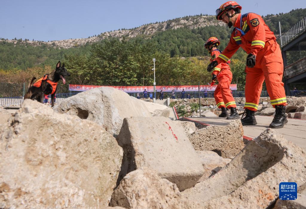 10月14日,參賽訓導員和搜救犬在進(jìn)行廢墟搜救。