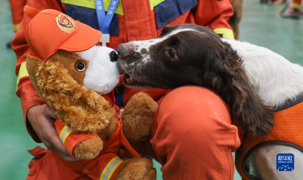 10月14日,在頒獎儀式上,一搜救犬好奇地嗅著(zhù)消防搜救犬玩偶。