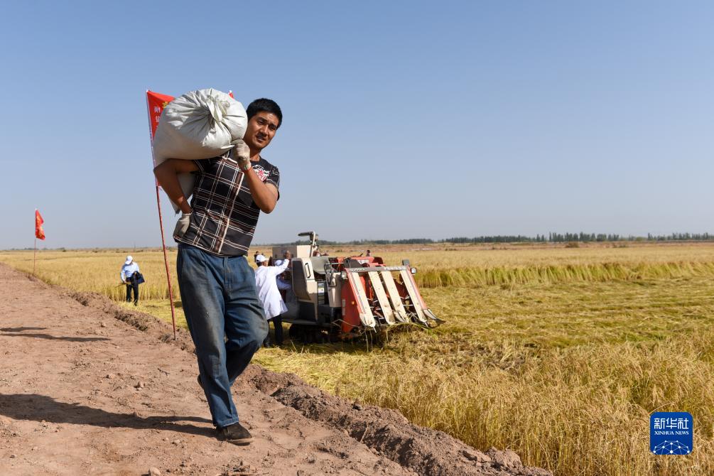 10月13日,新疆阿拉爾市測產(chǎn)田塊,工作人員在搬運測產(chǎn)稻谷。