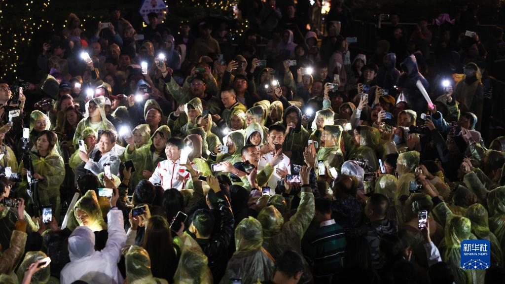10月13日,剛剛在杭州亞運會(huì )皮劃艇項目上獲冠軍的帥常文(白衣左)與在龍舟項目上奪冠的楊海雷(白衣右)在貴陽(yáng)市文昌閣路邊音樂(lè )會(huì )現場(chǎng)演唱。