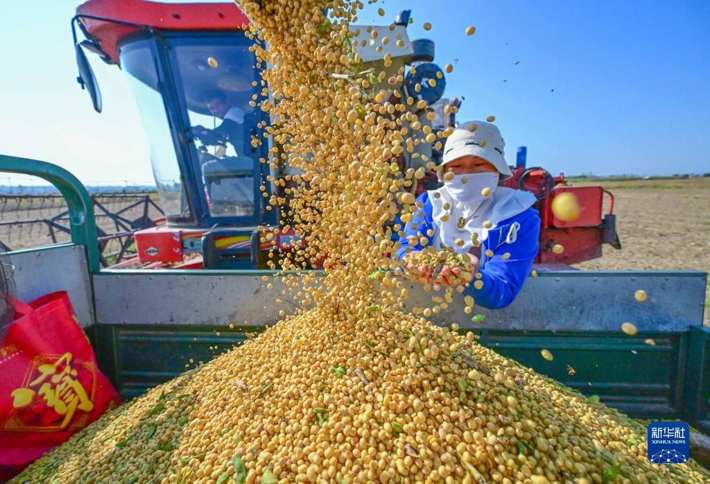 10月14日,在河南省洛陽(yáng)市孟津區會(huì )盟鎮黃河岸邊的下古村,農民收獲大豆。