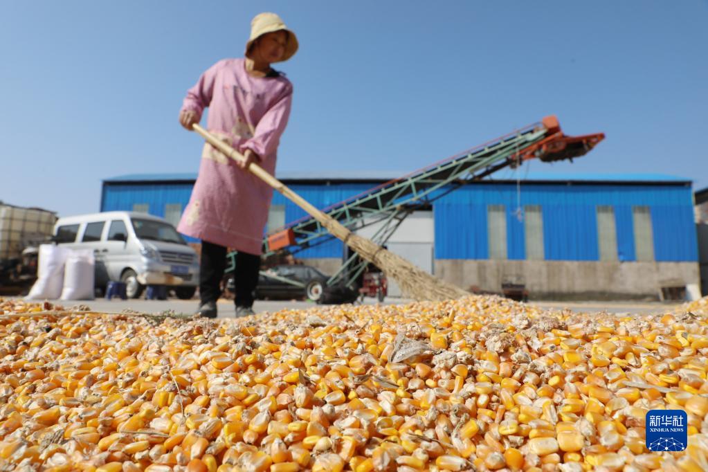 10月14日,河南省焦作市溫縣岳村街道西坡村農民在場(chǎng)院收晾曬干的玉米。