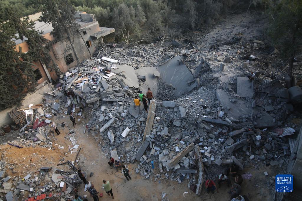 10月14日,在加沙地帶南部城市拉法,人們查看遭以色列空襲炸毀的建筑廢墟。