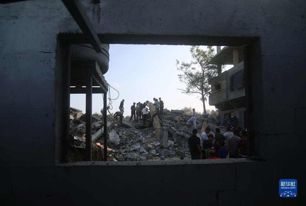 10月14日,在加沙地帶南部城市拉法,人們查看遭以色列空襲炸毀的建筑廢墟。