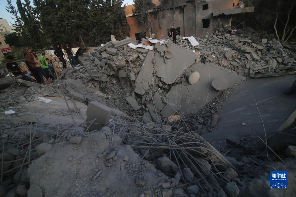 10月14日,在加沙地帶南部城市拉法,人們查看遭以色列空襲炸毀的建筑廢墟。