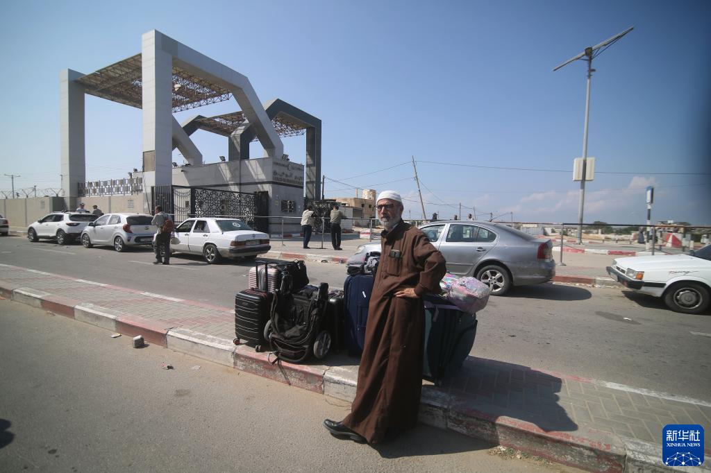 10月14日,一名外國公民在加沙地帶和埃及邊境的拉法口岸等待撤離加沙地帶。