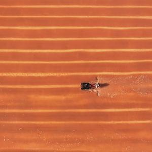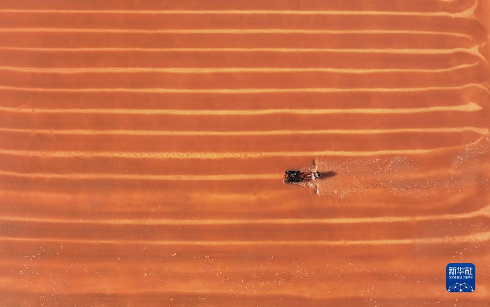 10月14日,工人在河北省灤南縣嘴東經(jīng)濟開(kāi)發(fā)區鹽場(chǎng)收獲秋鹽(無(wú)人機照片)。