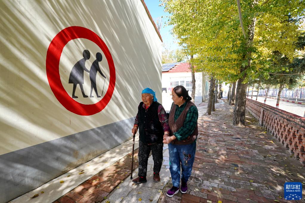 10月14日,居住在河北省康??h土城子鎮互助幸福院的老人在院子里行走。