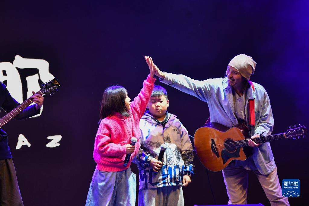 10月14日,大南坡小學(xué)學(xué)生王藝可(左一)與參演樂(lè )手在表演后擊掌。