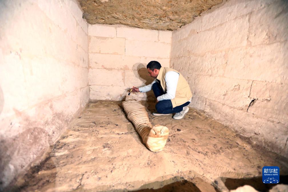 10月15日,在埃及明亞省考古現場(chǎng),考古人員清理一座石鑿墓中的木乃伊。