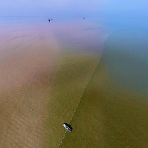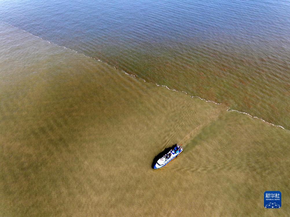 在山東省東營(yíng)市黃河入???,黃河匯入渤海。黃色的河水和藍色的海水之間形成了一條“分界線(xiàn)”,河黃海清,涇渭分明。
