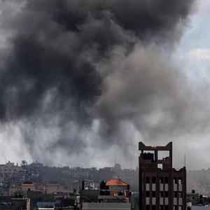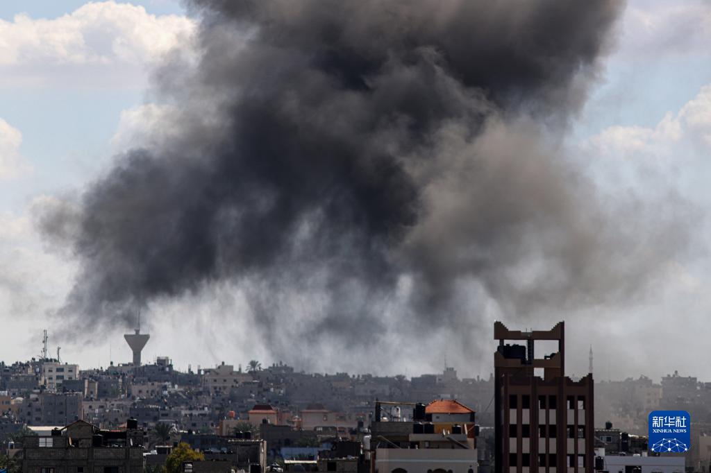 10月15日,加沙地帶南部城市汗尤尼斯的建筑遭以色列軍隊空襲后升起濃煙。
