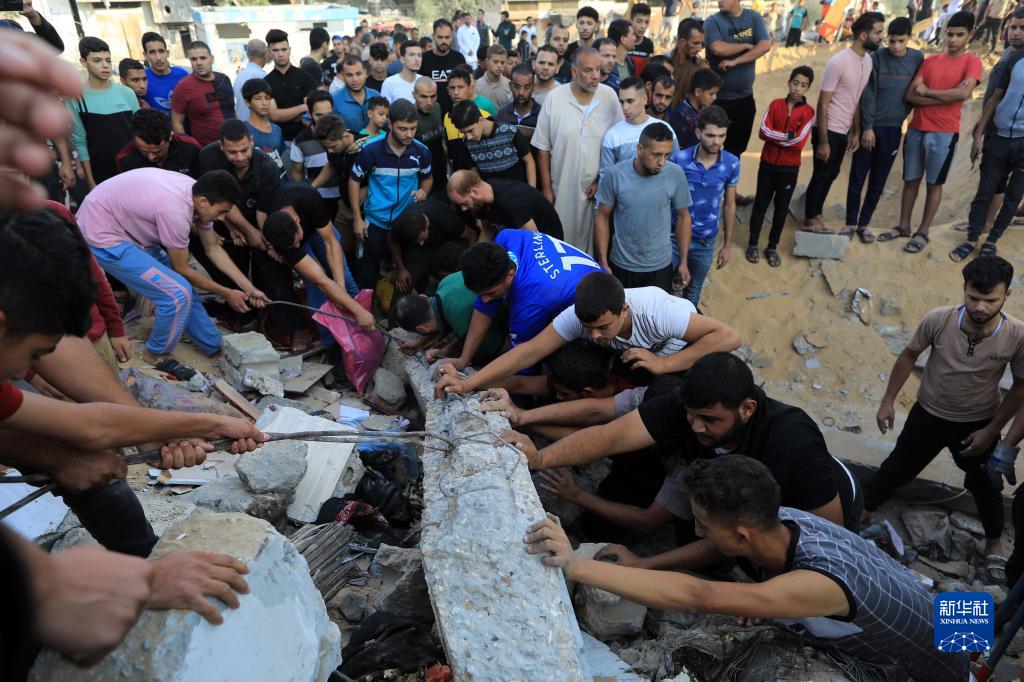 10月16日,在加沙地帶南部城市汗尤尼斯,人們在遭以色列襲擊后的建筑廢墟中救援傷者。